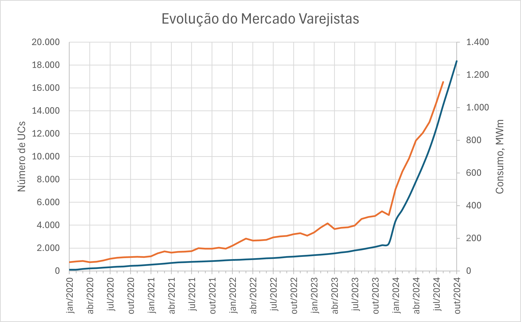 O mês de outubro de 2024 se manteve movimentado com a migração de 1961 novas Unidades Consumidoras (UCs). Número um pouco maior que setembro e ainda mais próximo do recorde de agosto, sendo a terceira maior marca desde janeiro.