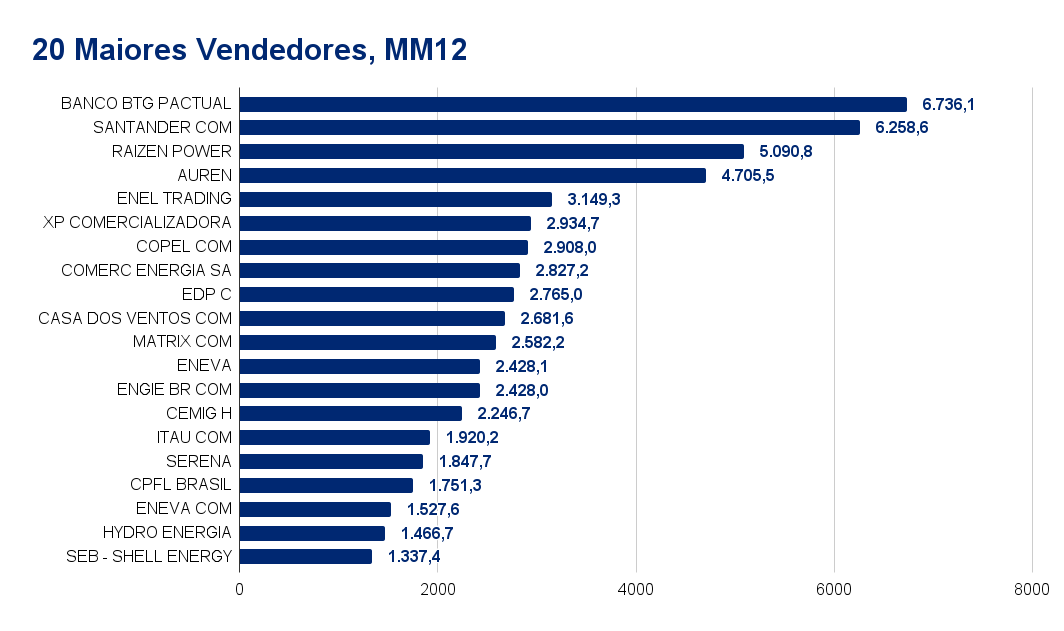 • COMERC ENERGIA SA (3.646,3 MW médios) e CASA DOS VENTOS COM (3.546,9 MW médios), demonstrando a força das comercializadoras com foco em energia renovável e flexibilidade contratual.