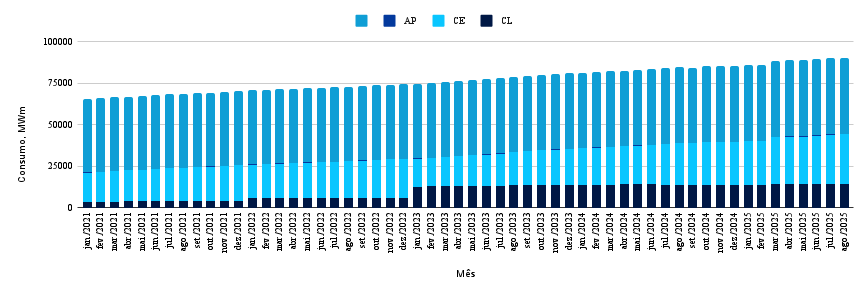 O gráfico mostra que agosto/2025 manteve o consumo em um patamar elevado, alinhado ao comportamento dos meses anteriores e reforçando a consolidação da nova base de consumo do ACL.