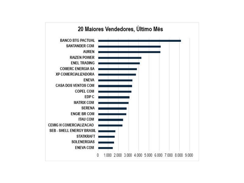 Na sequência do ranking, comercializadoras como Raízen Power, Enel Trading, Comerc Energia SA e XP Comercializadora aparecem com volumes entre 3.000 e 5.000 MW médios, compondo um bloco de empresas estratégicas com performance sólida e atuação em diferentes nichos do mercado.