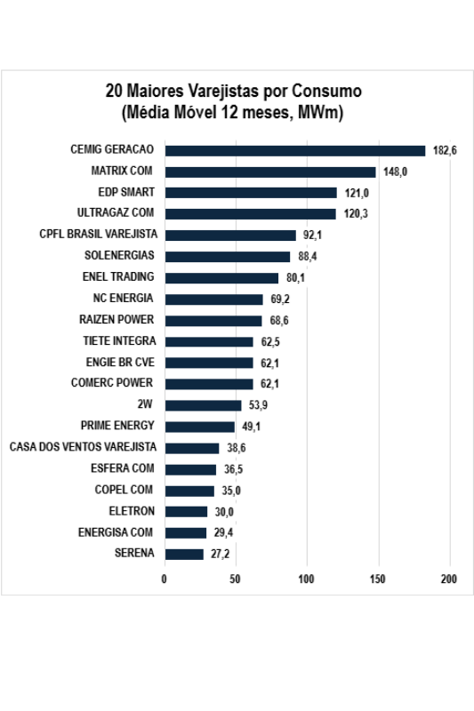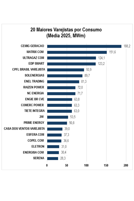 • CEMIG Geração segue soberana no topo do ranking, com 188,2 MWm de consumo médio nos últimos 12 meses — um avanço expressivo frente ao mês anterior. A comercializadora reafirma sua posição como principal referência do modelo varejista no mercado livre, com escala e robustez.