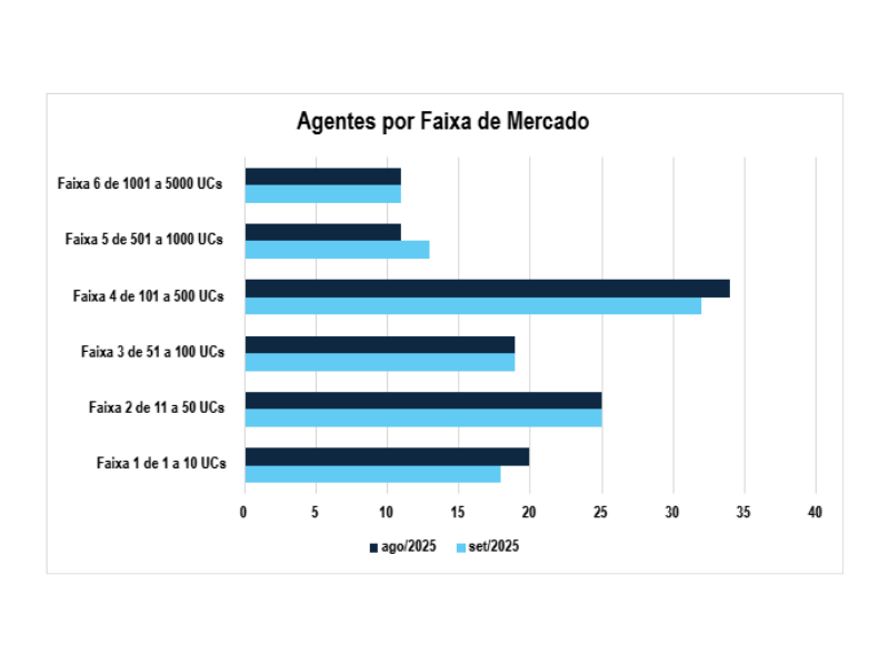 • A faixa de 101 a 500 UCs segue como a mais representativa do mercado, agora com 33 agentes ativos, uma leve redução em relação aos 34 registrados no mês anterior. Ainda assim, essa faixa concentra o maior número de comercializadoras com operação ativa, reforçando seu papel como principal porta de entrada no ACL. Essa estabilidade pode indicar o início de uma transição do mercado para um novo ciclo de consolidação.