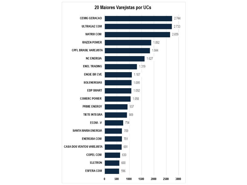 Em novembro de 2025, a CEMIG Geração manteve a liderança absoluta no ranking de UCs varejistas, totalizando 2.744 Unidades Consumidoras (UCs) sob gestão. Logo atrás, a Ultragaz COM se consolidou na vice-liderança, com 2.733 UCs, enquanto a Matrix COM aparece em terceiro lugar, com 2.659 UCs.