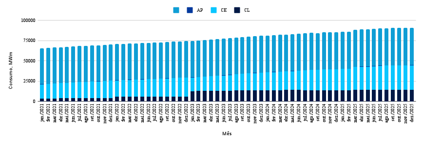 O gráfico atualizado demonstra que, mesmo com a variação entre novembro e dezembro, o consumo no ACL permanece dentro da faixa elevada consolidada ao longo de 2025. Ou seja, não se trata de uma mudança de tendência, mas sim de uma oscilação natural dentro de um ciclo já estabilizado em níveis altos.